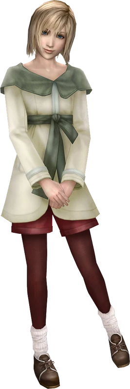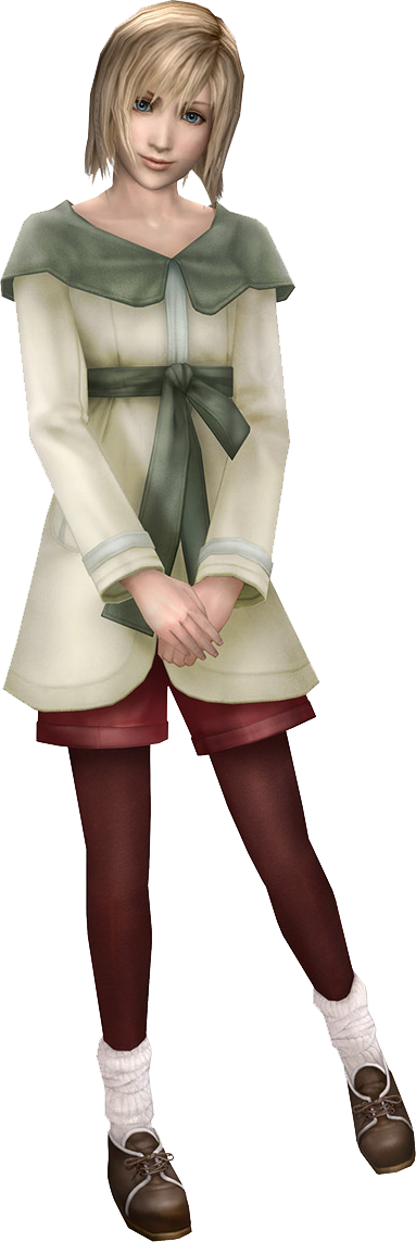 In Parasite Eve II, her uniform is similar to the PsySuit, with the collar in red, and red stripes going down sides and the cuffs of her sleeves, across the pockets, and along the bottom hem of the torso. She wears simple black shorts, although they are covered by her uniform, and a pair of black and red sneakers.