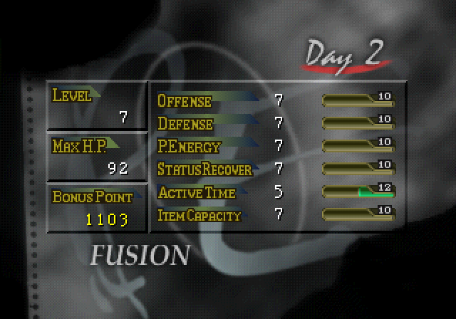 One of the principle RPG elements of the game is that experience-based levels are present. Each time the player's level increases, their attributes go up and BP (Bonus Points) are given. These points can be distributed to the ATB, item capacity, or attributes of a weapon or armor.