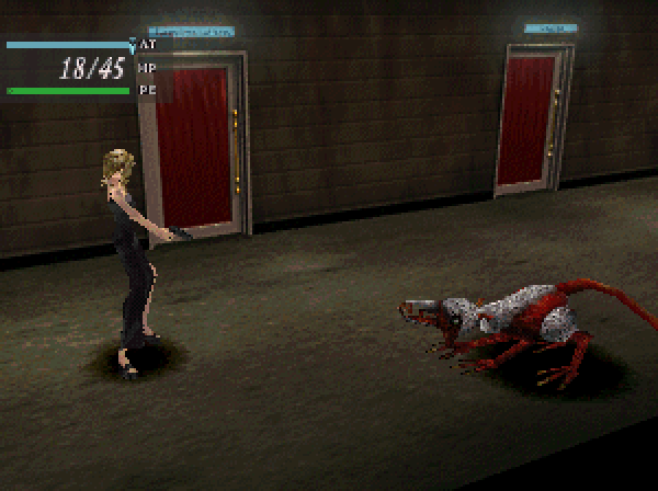 In battle, the player has an "Active Time Bar" (ATB) that sets the time for every turn to take action. Upon each turn the player may choose between attacking with their equipped weapon, using PE (Parasite Energy) for defense, assistance or attack, using items, changing weapon or armor, or escaping the battle. If the player chooses to attack, a dome symbolizing the range of the weapon appears. If the enemy is outside of the range, the shot is likely to fail. Even if the shot lands, the damage will be less than normal.