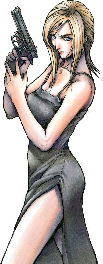 Aya Brea holding a handgun.